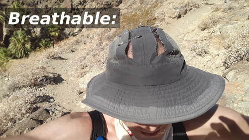 Tip #18: Ventilate your head.If you wear a sun hat, it needs to have really good ventilation like a mesh that you can see through. Or you can wear a golf-style visor, or just cut holes in the top of the hat like I did in the photo. Otherwise it's cooler to just not wear a hat. I haven't gotten a sunburned scalp yet, but I may consider sunscreen on top just in case... |