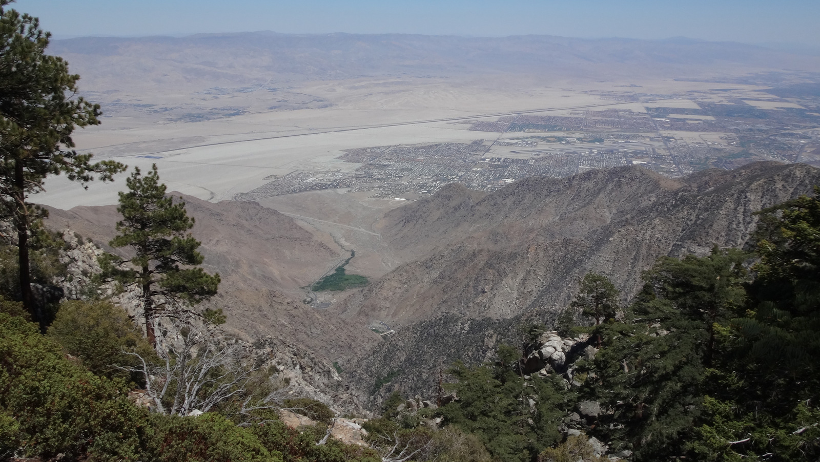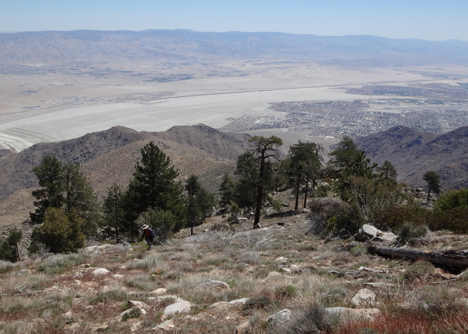 Around six thousand elevation we finally reached the pine trees and ate lunch in the shade with a great view down to Palm Springs. The next thousand feet of gain offered slightly easier, less brushy terrain, which we slowly zigzagged up.