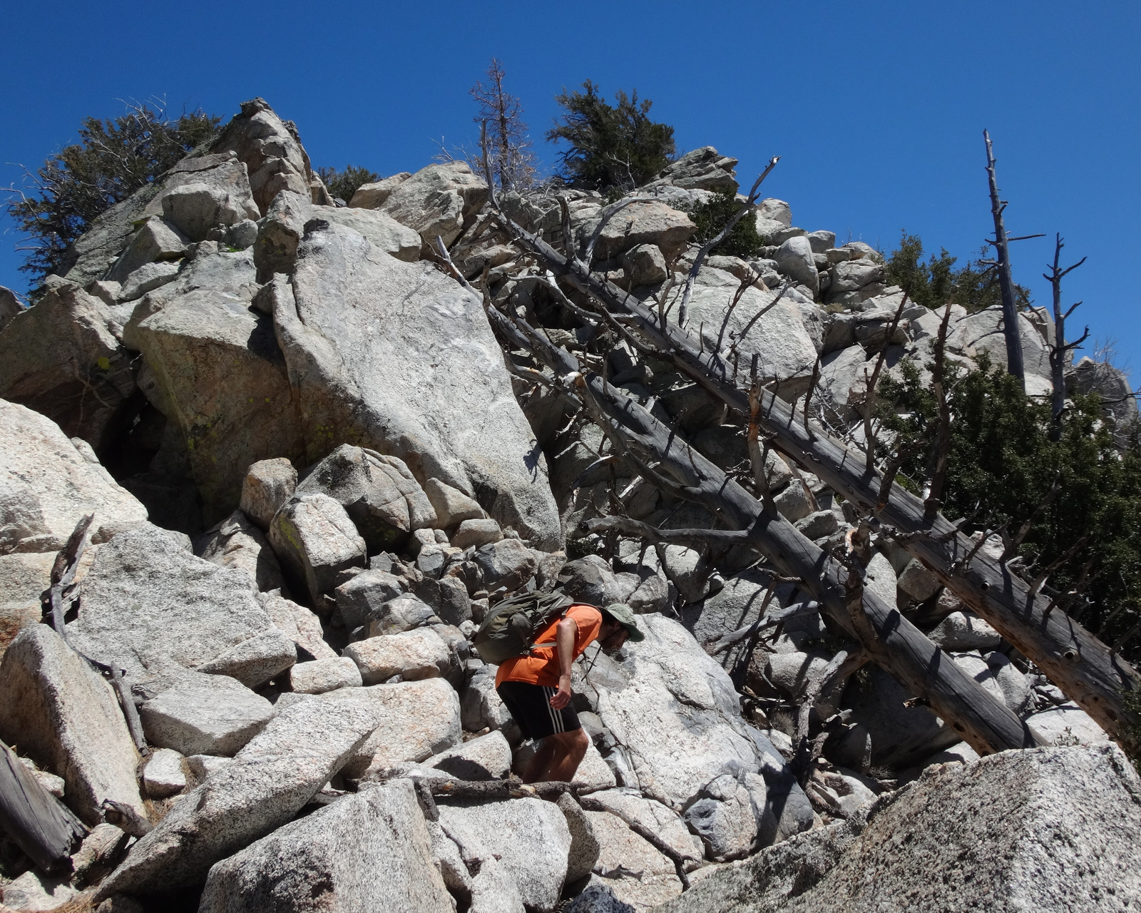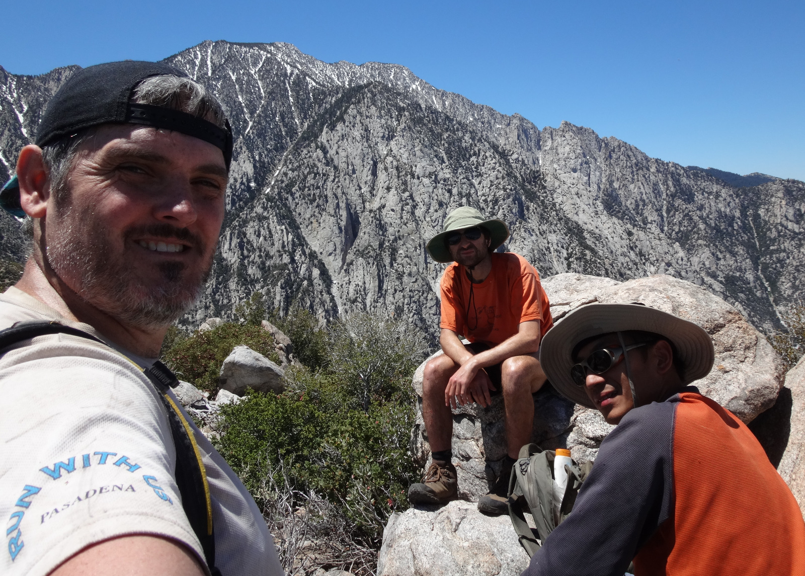I was starting to feel a bit nauseous from the sun exposure. When we stopped at the 7446' bump, with an open view of the great north face of San Jacinto, I threw down some more food and polished off the rest of my water. I had carried five liters, plus a bottle of coconut water. Still I needed more to stay comfortable and keep a reasonable pace. Henry was carrying seven liters even though he rarely uses that much, so he let me have one.