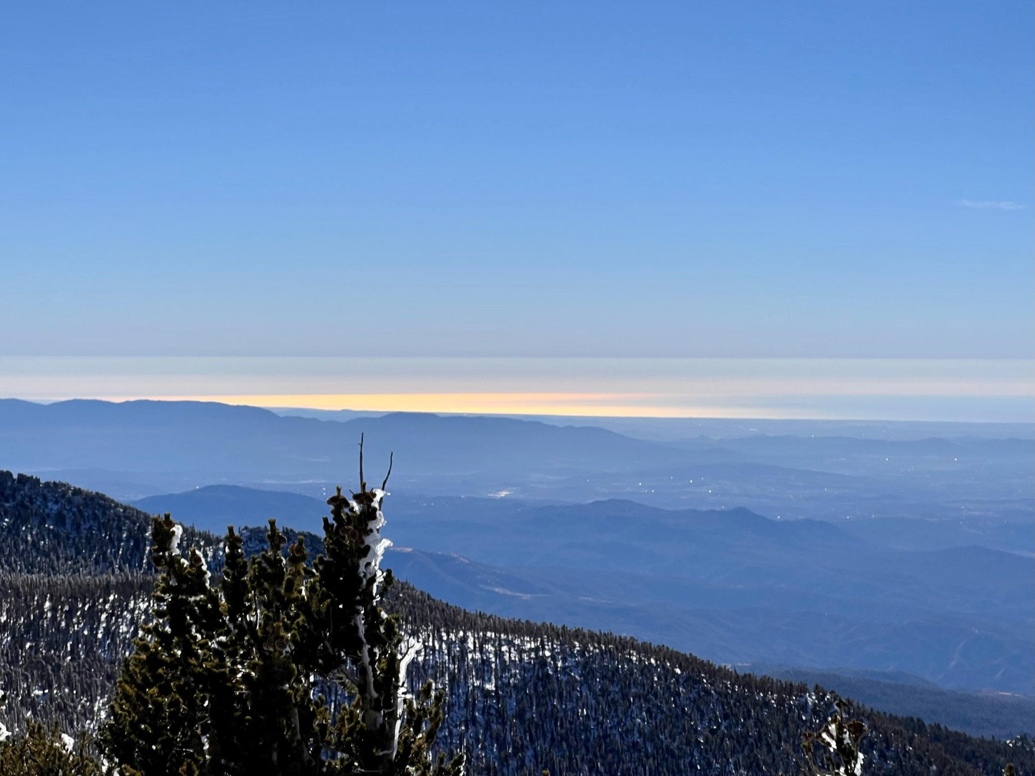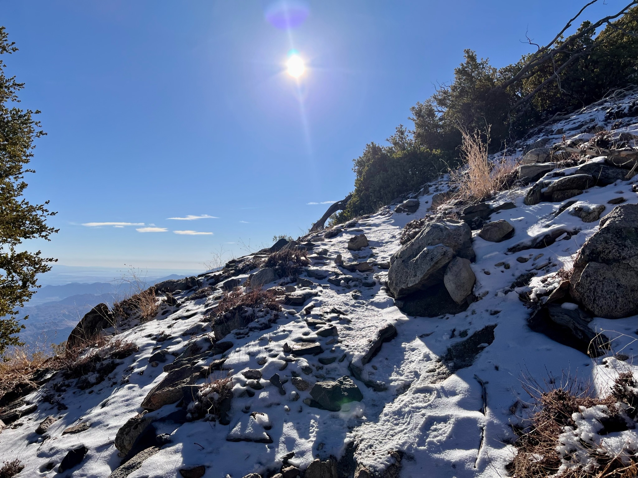 The long rest didn’t help, I am cold and glad I to back on the trail, making good progress in slush up the mountain. Reaching the top and enjoying great vistas. Definitively better views than the couple of times I have been up here before. Catalina island and the one behind it, the coastline and all the distant mountain peaks.