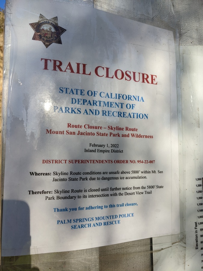 Effective Tuesday 1st February 2022 the State Park closed the section of Skyline Trail that falls within its jurisdiction, above 5800 ft elevation, "due to dangerous ice accumulation" ... The Superintendent stated on 25th April "we are monitoring weather conditions and the route and hope to reopen in the coming weeks". The State Park boundary is not marked but is near the site of the old Florian’s Cache, below Flat Rock.