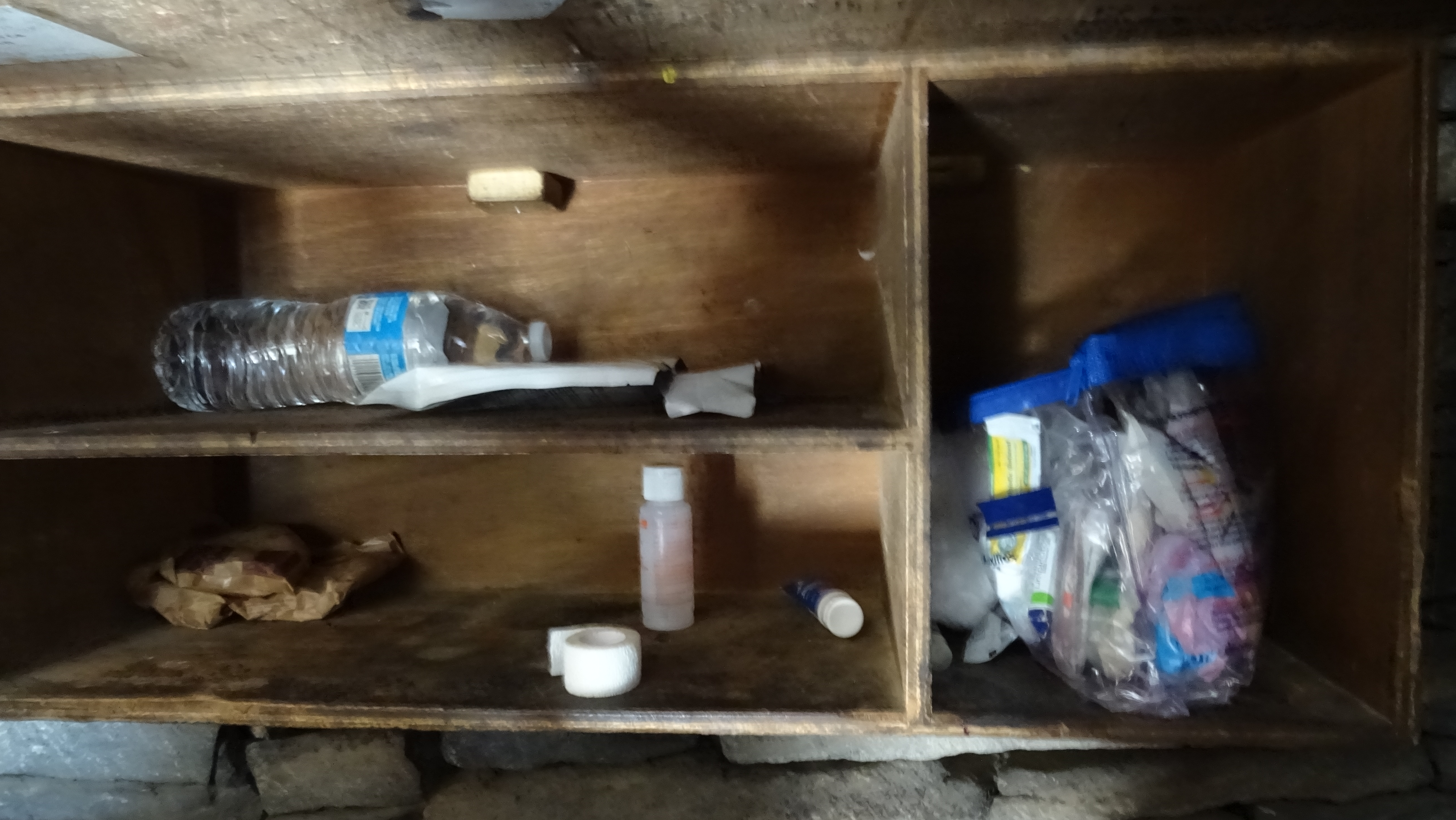 Apparently the emergency food cupboard is run by Old Mother Hubbard because the cupboard is pretty much bare. The only food I recognized was three packets of instant oatmeal. I suppose the problem of pilferage (by people not rodents!) precludes keeping the cupboard stocked. Imagine a scum bag so low as to steal emergency supplies for the sake of convenience. It also happens to the emergency water on the Skyline route. It's difficult to comprehend what might bring someone to stoop so low.