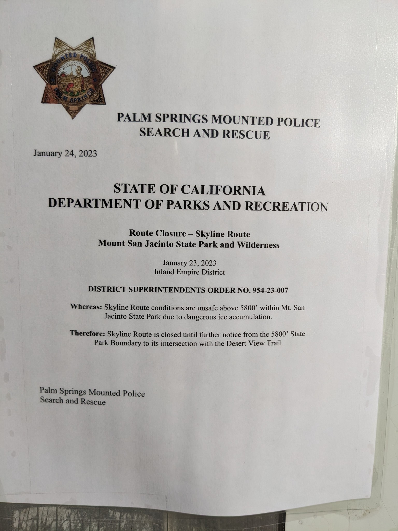 Per the facebook post .. Please be advised of the Skyline Route, also known as “Cactus to Clouds” partial trail closure at Mt. San Jacinto State Park. As you may have heard in recent news, there has been a recent string of our fellow hikers go missing in the wilderness of Southern California. This Winter has proven to be substantially better than previous years in terms of snowpack - while great for water availability in the later seasons, this has led to mountaineering conditions on many trails throughout the region. We appreciate those that adhere to precautionary closures that not only keep members of the public safe, but first responders (many being volunteers) as well.