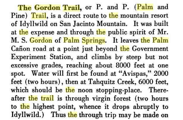 whitebark wrote:Note that the "Idyllwild Trail" shown on the old map - the one that takes the crazy route across Taquitz Canyon - is a completely different trail than the Gordon Trail - I think.