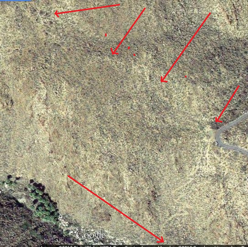 From google terrain; Andreas Canyon with trail starting starting past the cyclone fence and going up. I added the red arrows.