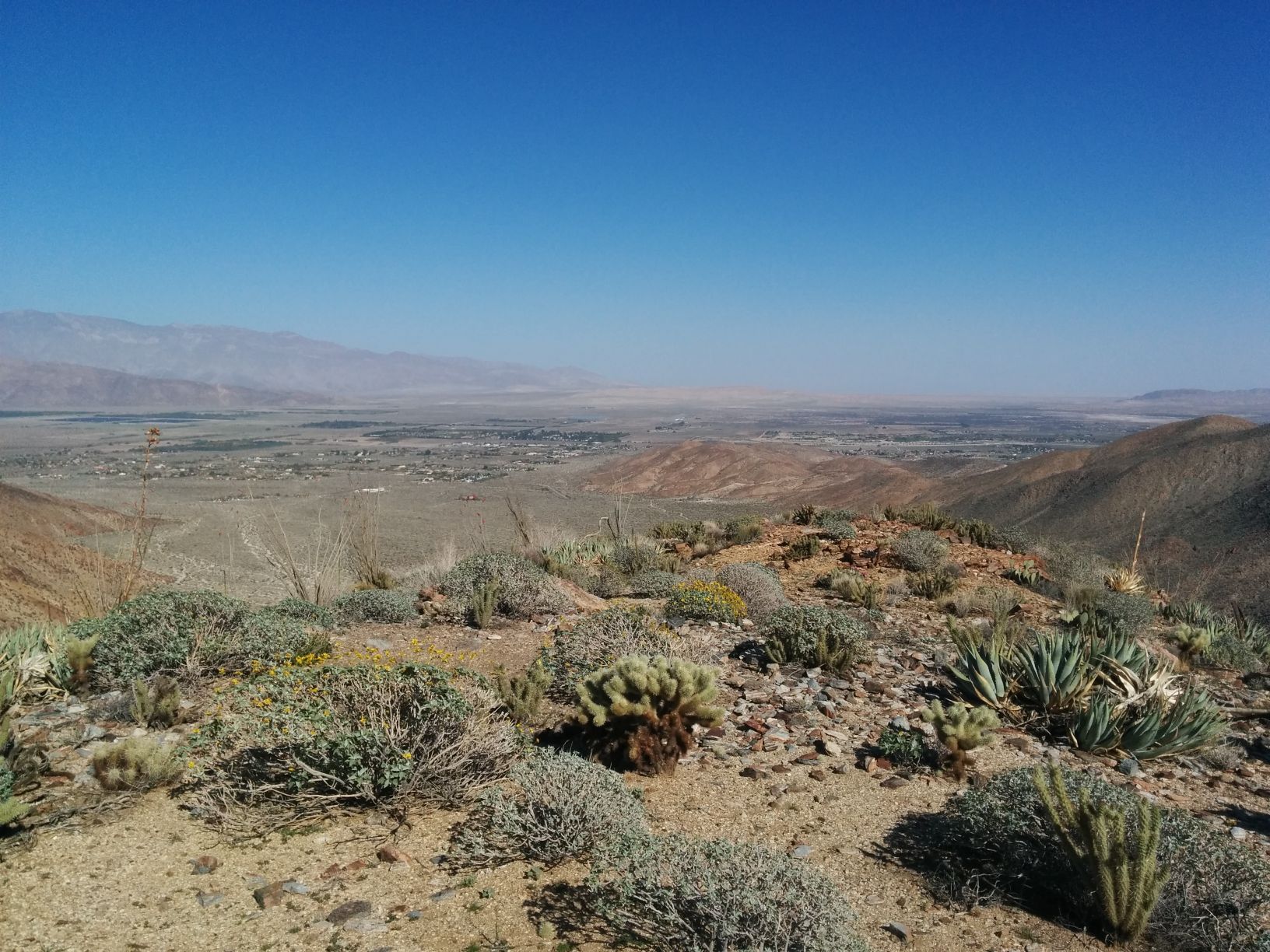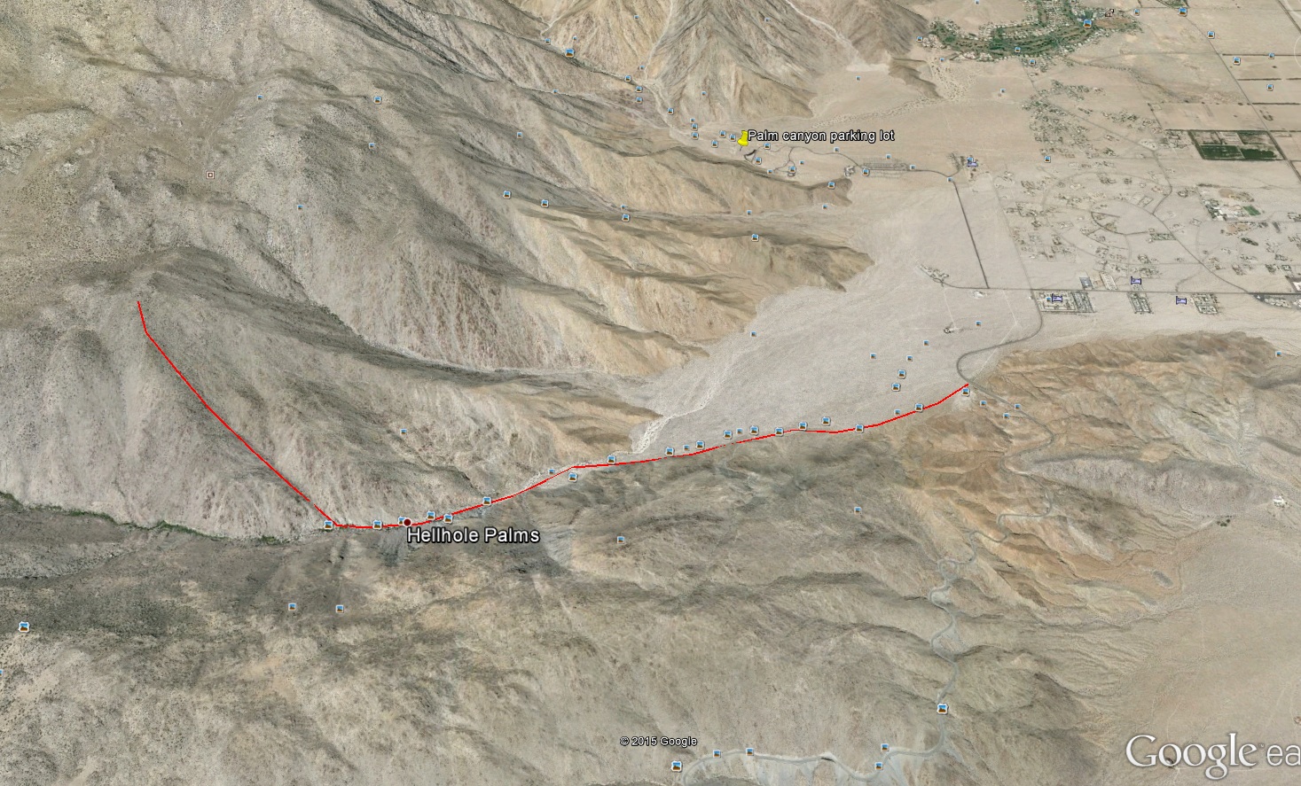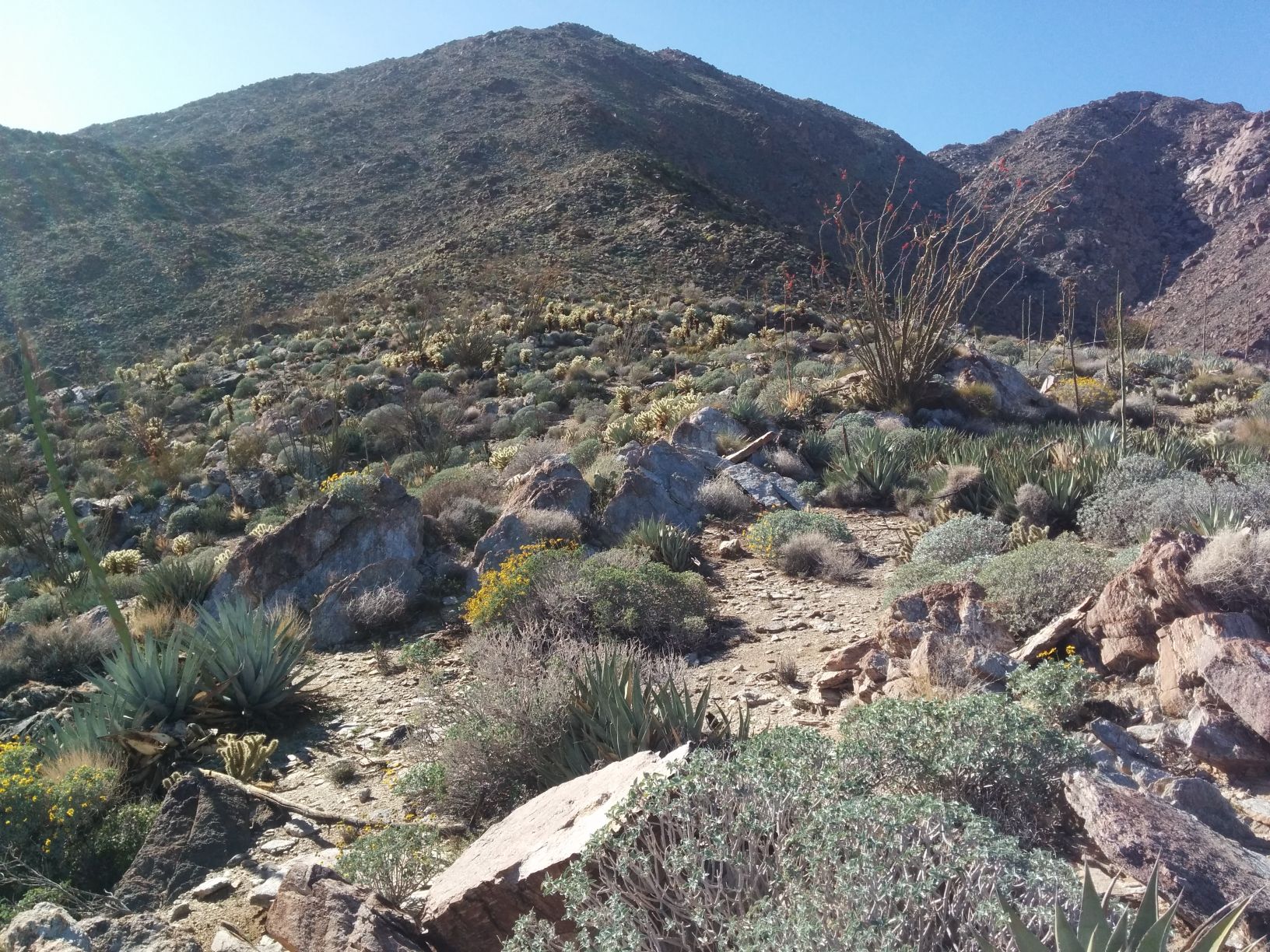 Hello, I made an image with google earth with a proposed route up to this little peak in Anza-Borrego. Has anyone walked up this way? Can I just walk up the ridge to the top or is the surface too rough/rocky? I have not really done any off-trail hiking in the desert but this might be a good start since it is not way back in the hills or anything.