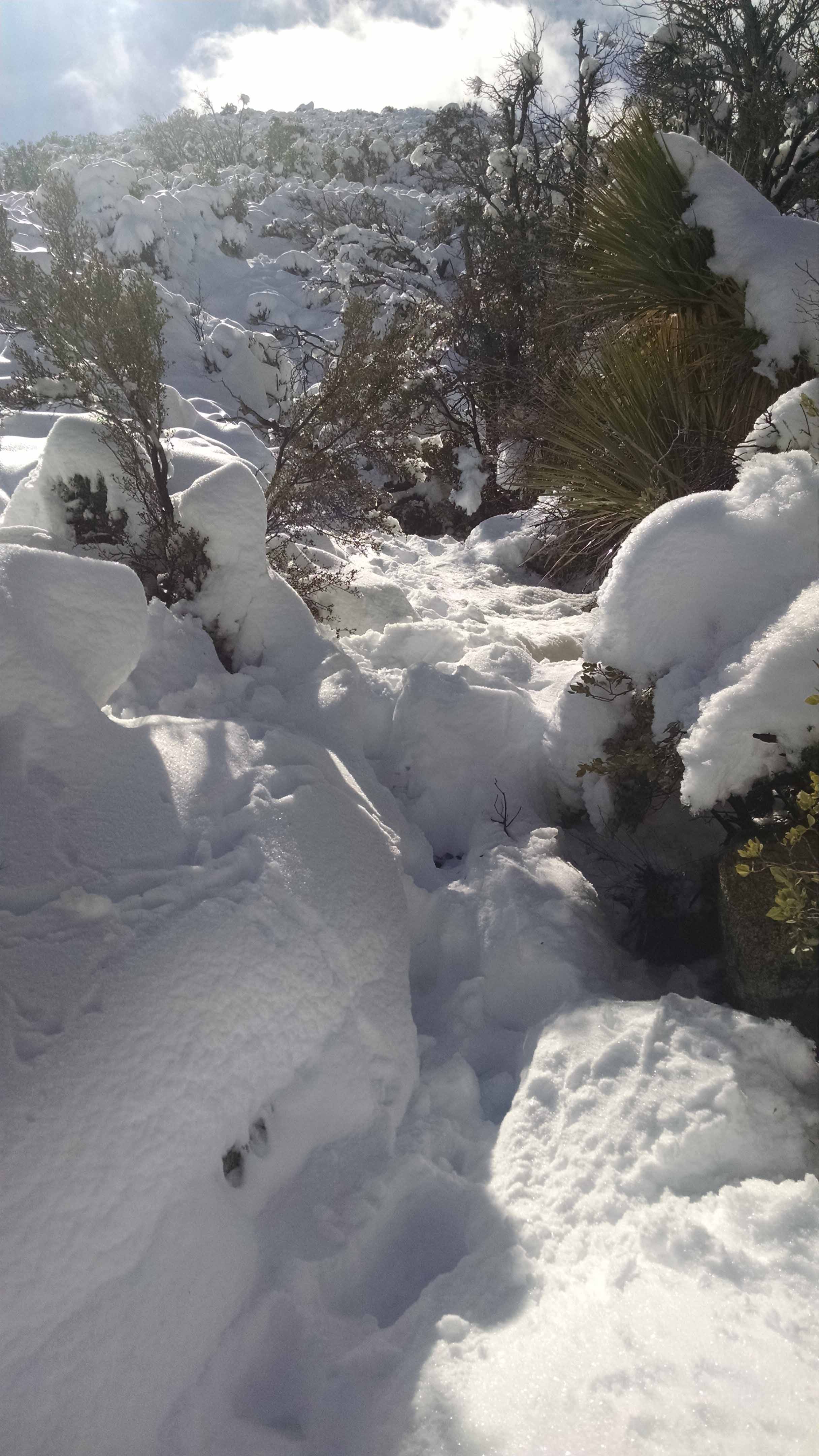 Just some photos to show snow conditions. Lots of snow above 5,000, and 2-3+ feet above Flat Rock. Turned around below 6,500 (too slow breaking trail for time allotted). BTW, Steve and Anya, nothing lost on trail that I could see. Did you say hi to Huy as he went by? Small world.