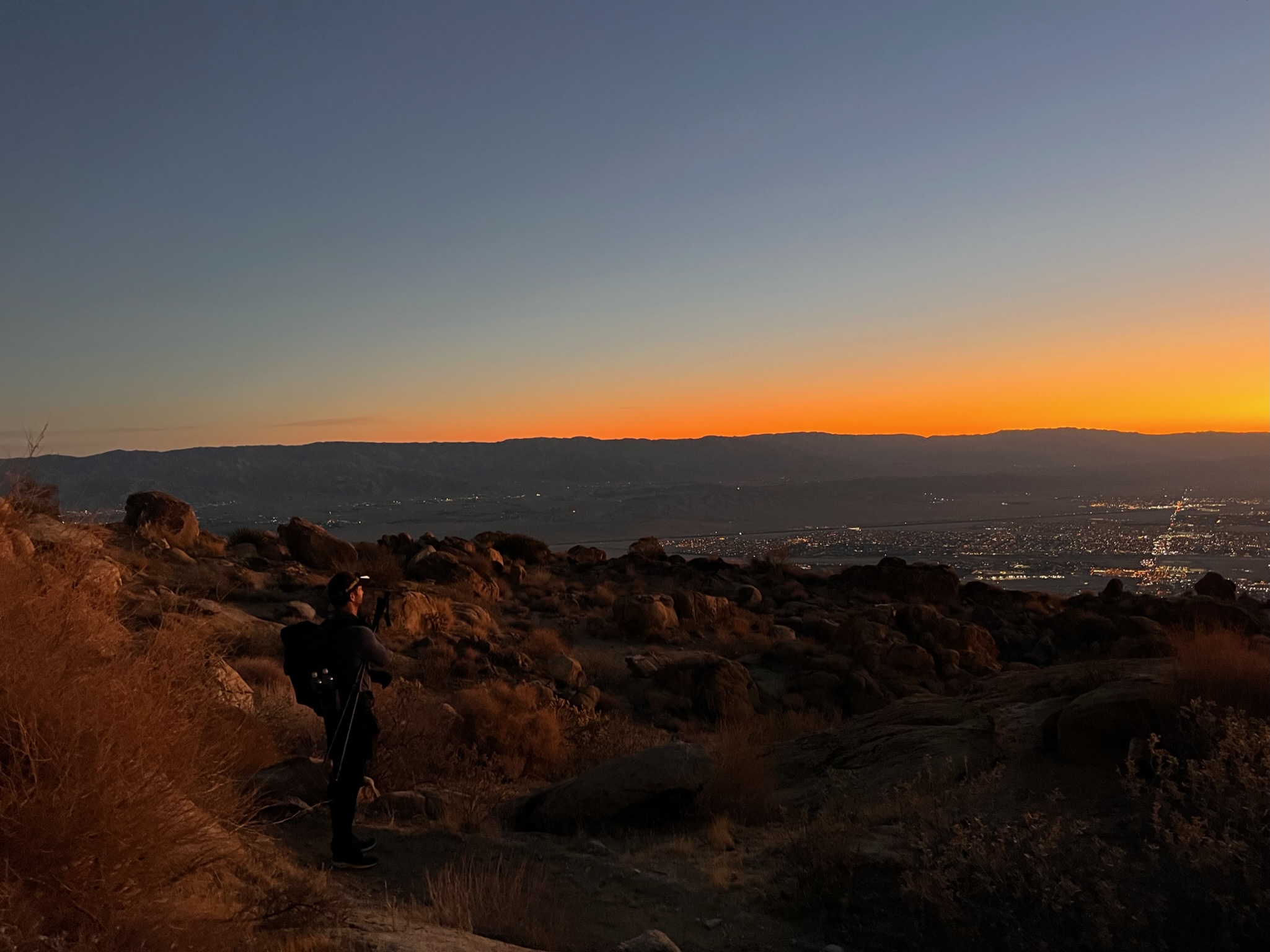 Pretty soon, we are rewarding the steep uphill with amazing night views of Palm Spring. Did not see my hiking buddy in the past 6 month, so we are talking a lot, while hiking uphill…errr…ok, I am falling behind anyways and after an hour I DEFINITIVELY feel my legs and force myself to slow down a bit, but the view is breathtaking. Making good progress and we so excited once we reach the worlds most famos pile of rocks that we are heading down the wrong trail. Oh no, we soon realize, but have to hike back up again, wasn’t more that 1/4 Mile, oh well.
