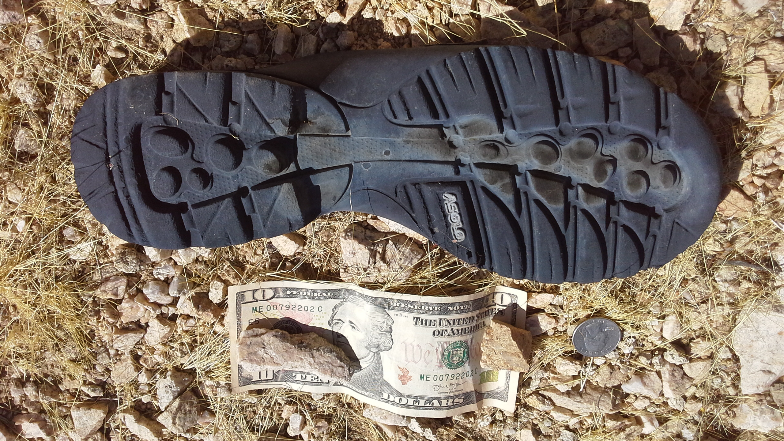 I don't think I'll buy ASOLO shoes if the outsoles rip off like that. How could somebody keep hiking and not realize their outsole was gone? I would have picked it up and used Shoe Goo or contact spray at home. The brand does not match Paul Miller's, and it was very close to where SAR had passed through.