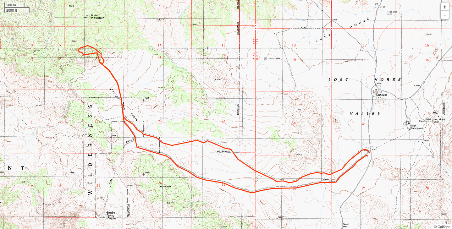 Day 2 (Sunday): I started at the Juniper Flats Parking lot, took the Juniper Flat Road, to Juniper Flats, and walked around the base of Quail mountain/area to the west, and then took back Stubbe Springs? Trail to the Juniper Flats Parking lot.