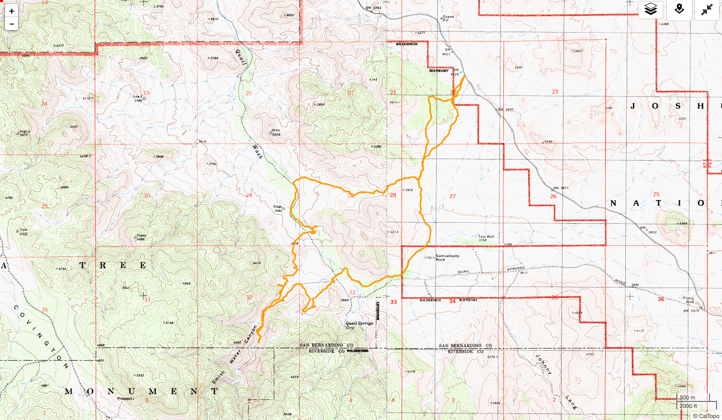 Day 1 (Saturday): I started from Park Road and somewhat followed the 10.6 mile radius initially, then headed towards Samuelson's rock/Quail Springs, towards the mouth of Smith Water Canyon, did a little bit of exploring there, and then made my way back to Park Road the opposite way.