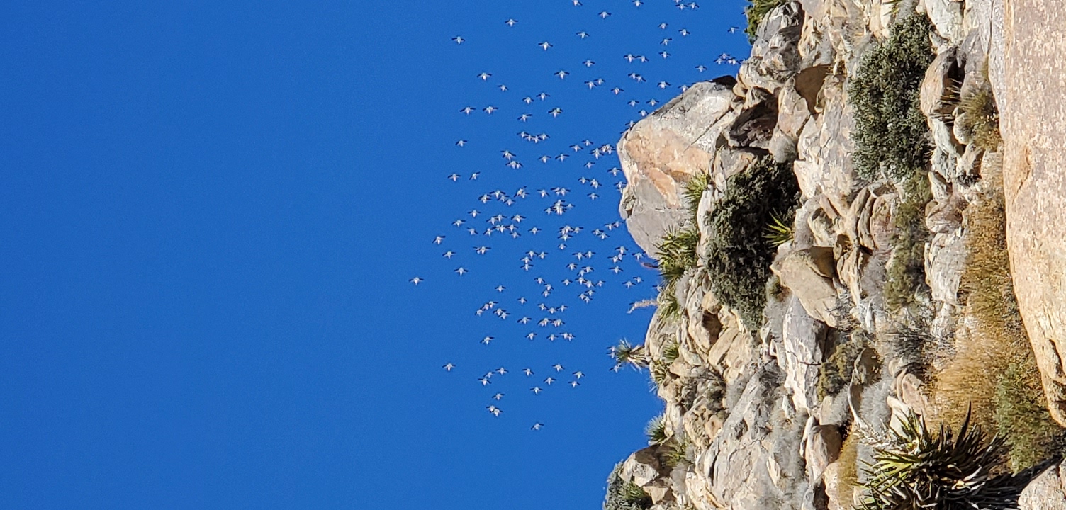 Thank you Rumpled! That looks like it is on the money. I tried using a bird identifying app, but there was not enough clarity in the photos when zoomed in on for an accurate identification. I see in the listing of birds in JT put out by the NPS that they are a rarer sighting and only have a migratory presence. I took the pictures on March 18th and they were headed in a rather leisurely northwesterly direction. I found this video on Youtube, and the flock I saw was exactly like the one in this video: https://www.youtube.com/watch?v=XD0KmKk9wN4 It was a beautiful sight.