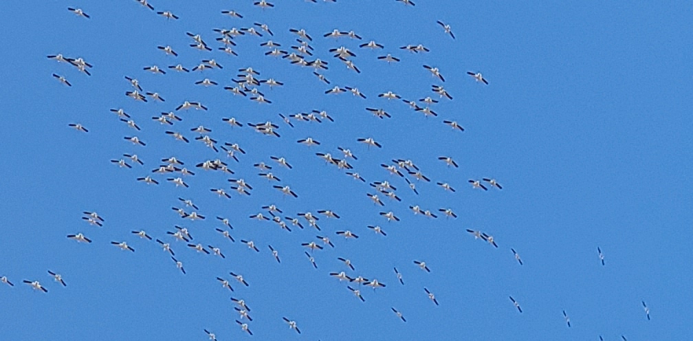 Looked like large white flocking birds. First thought was snow geese but the black markings didn't match. In the pic looks like bent necks like a pelican. Quick Google showed I was likely correct considering wing patterns and migration destinations.