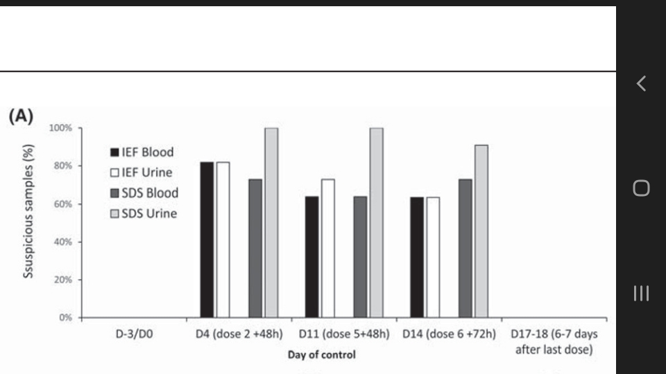 In the attached images from the Cox 2021 paper, Day 56 is 2 weeks after the last EPO injection, and Day 70 is 4 weeks after. RET and IRF are currently used in the passport. After 2 weeks they start to climb back towards baseline values. CD71/B3 is the ratio of 2 proteins: one found in the newest of new red blood cells and one found in all red blood cells. This biomarker remains well below baseline even at 4 weeks after last injection which means it's better at catching dopers. Interestingly, the placebo values are a little above the baseline. Maybe this is from all the blood draws or iron supplements. Just guessing